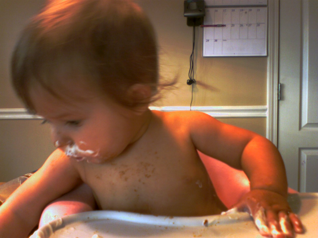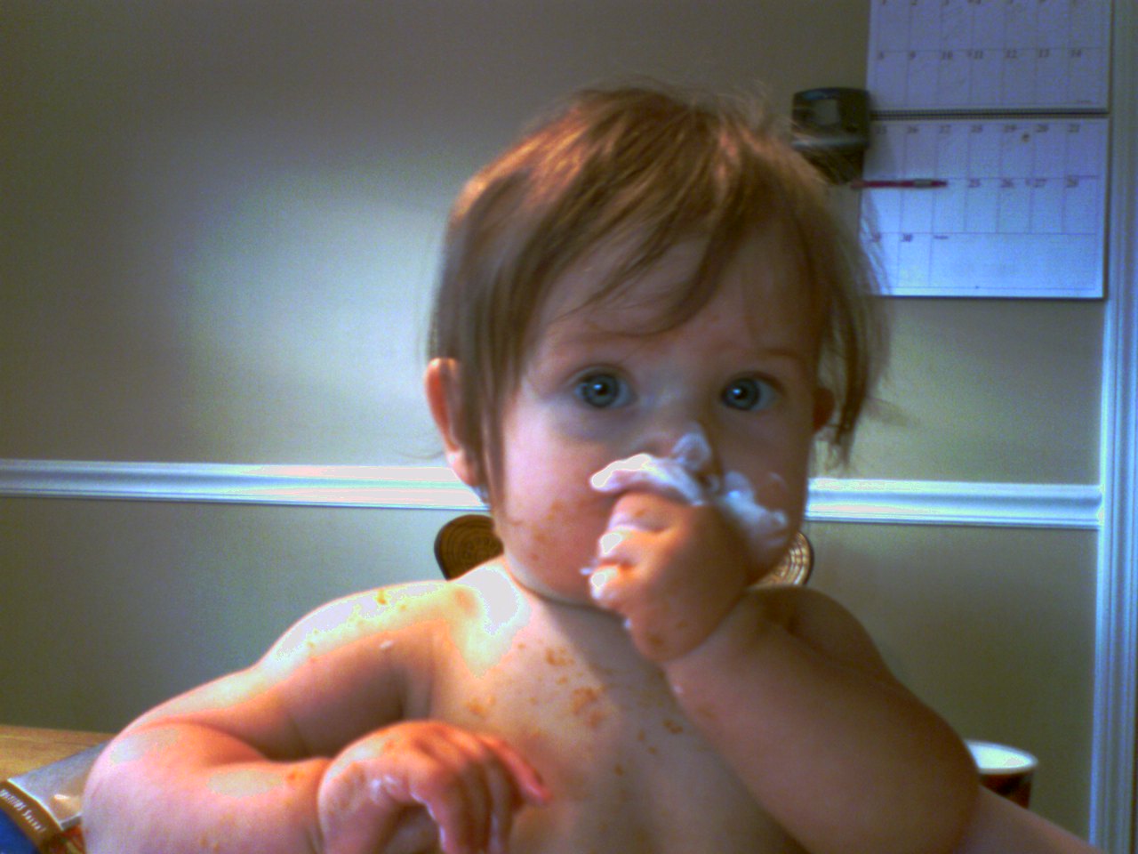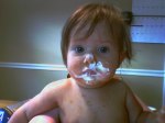 On to tonight, where K waited patiently, or so I thought, for me to get her food ready… once I got to the table, I found her happily sucking on the spoon she had grabbed from the sour cream sitting on the table, and sour cream from ear to ear… yes, she’s not quite seven months old…